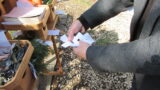 葉も落ち仙台市街地や遠くに海まで見通せます。 この度の月次祭のクライマックスは斎藤さんの奉納舞でした。 いつもは松の会で作成した「ひふみ・いろは神歌」を流す中での舞だったのですが、本日は曲が終わった後、一度止まった舞が噴き出すように続いたのです。 まるで曲の旋律に封じ込められていた何者かが解き放たれたかのように…。 「さぁ―――――っ」「すぅ―――――うっ」と時に雄たけびを上げながら、息吹を吹いたり地面や中空を切り裂いてみたり、突き立て、突き固めたりとそれは続きました。 圧倒されました。 参列者の小泉さんはこの時、大きな雲が吸い寄せられるように真上に来たらパツと四方に砕けるように散っていく様をご覧になられていたそうです。(写真参照:上空を見上げている小泉さんが捉えられています)